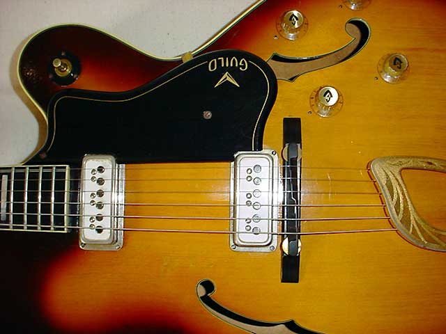 - Dearmond Single Coil Tonabnehmer wie sie in den 5oer-Jahren auch bei Gretsch Gitarren Verwendung fanden. Diese klingen in etwa wie Fender Stratocaster Tonabnehmer aber von Allem irgendwie mehr. Diese Tonabnehmer wurden bei Guild nur gut 1 Jahr verbaut so dass sie relativ selten sind. Das 50er-Jahre Modell hatte Tonabnehmer des Herstellers Franz die optisch Gibson P-90 Tonabnehmer ähneln, aber über weniger Output als diese verfügen. Darüber hinaus sind die Fertigungsschwankungen bei den Franz-Tonabnehmern erheblich größer so das diese recht unterschiedlich klingen können. Ab 1963 wurden dann die sog. Guild Humbucker verwendet.