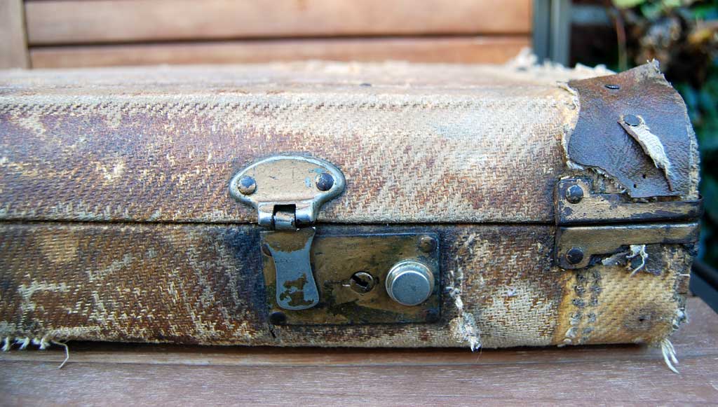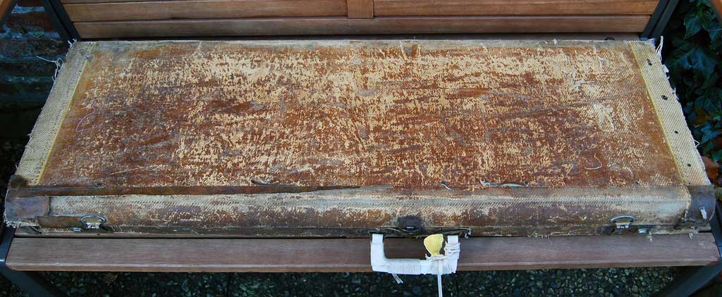 - Altes Tweed Case (oder was davon übrig ist) aus ca. 1958/59 mit neuem (altem) Futter im Deckel. Braunes Innenfutter, die Cases aus 57 sind innen rot.